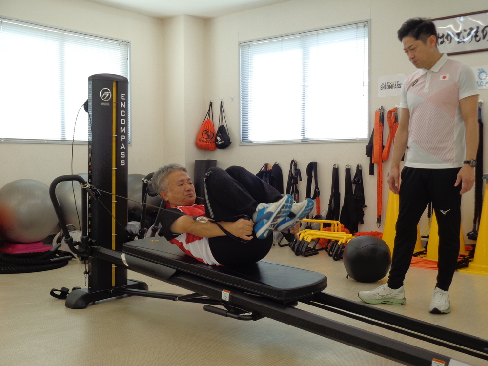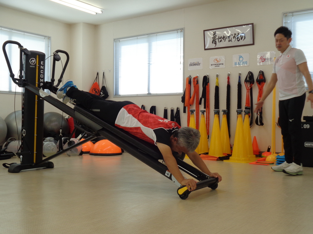 写真は、ENCOMPASSを活用し、運動生理学や解剖学等の科学的根拠に基づいたの指導を行っています。